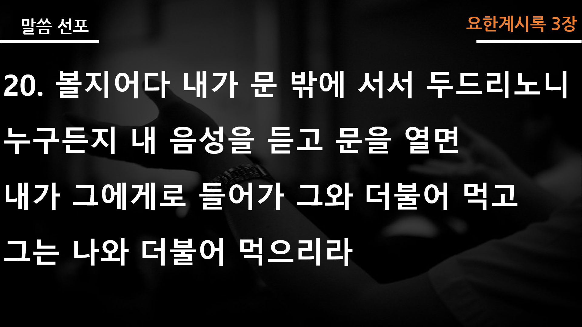 <이번주 말씀 핵심 포인트> 1. 주님이 말씀하시는 ‘문’의 의미는 문자적으로 ‘집의 문’을 뜻한다기보다, 비유적으로 ‘시간 또는 공간적으로의 가까움‘을 나타냅니다. 주님이 문밖에 서서 두드리고 계신다는 의미는 바로 우리의 삶에 가까이 와 계신다는 의미입니다. 2. 시간 또는 공간적으로 가까이 하신다는 의미가 뭘까요? 예수 그리스도께서는 2천년 전 육신을 입고 이 땅에 오셨습니다. 이는 시, 공간을 초월하는 사건이었습니다. 죄와 사망과 흑암의 권세에 놓인 사람들을 건져내사 영생을 주시려 주님은 십자가에서 죽으시고, 부활하시고, 승천하시고, 하늘 보좌에 앉으셨습니다. 그리고 누구든지 회개하고 믿는 사람의 마음 가운데 들어오셔서 영원토록 함께 하실 것을 약속하셨습니다. 또한 회개하고 믿는 사람의 마음에 들어오셔서 함께 하고 계십니다. 따라서 주님께만 영원히 우리와 함께 하실 수 있는 권리가 있습니다. 3. 이것이 바로 ‘복음’입니다. 주님은 이 땅의 모든 사람들이 복음을 듣고 문을 열기를 원하십니다. 그리고 이 복음을 주님 안에서 주님과 함께 누리기를 원하십니다. 지금 이 시간에도 복음은 계속 들려지고 있습니다. 주님이 우리 삶에 가까이 와 계십니다. 복음을 누린다는 것은, 죄와 사망의 권세 아래 놓인 내가 이제는 예수님 안에서 함께 죽고 살리심을 받았고, 하늘에 앉혀져 하나님의 자녀가 되었다는 진리를 믿음으로 주장할 수 있게 되는 것입니다. 여러분, 복음을 듣고 문을 열게 되면 주님과 함께 하는 삶이 시작됩니다. 주님이 나와 더불어 먹고, 내가 주님과 더불어 먹는다는 것은 주님과의 ‘친밀함’의 증거입니다. 아무나 주님과 함께 친밀함을 느낄 수 없습니다. 오직 복음(예수) 안에서 가능합니다. 문을 열기 전까지는 죄와 사망의 권세 아래 놓인 저주 받은 삶이지만, 문을 여는 순간 인생은 저주의 결박은 끊어지고 죄사함과 영생이 임합니다. 이제는 문 앞에 계신 주님이 우리 삶을 영원토록 책임지시기 때문입니다. 나는, 복음을 듣고 예수님께 문을 열어 드렸습니까? 복음을 누리는 삶이 시작되었습니까?