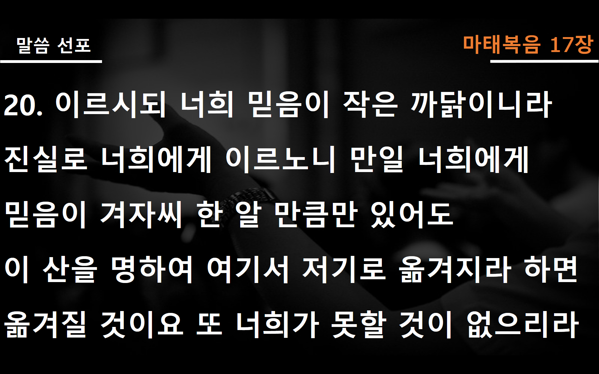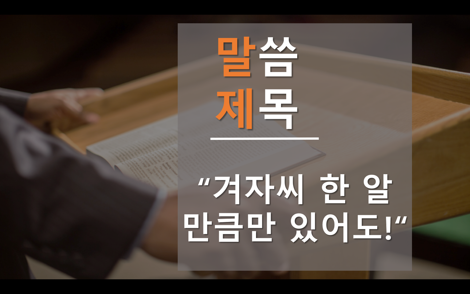 <이번주 말씀 핵심 포인트> 1. 이스라엘에서 자생하는 겨자씨는 지름이 1~1.5mm 정도로 아주 작습니다. 그런데 이 겨자씨가 자라면 모든 풀보다 커지고, 가지를 내며, 공중의 새들이 그늘에 깃들일 만큼 풍성해집니다. 2. 오늘 본문 말씀의 배경은, 귀신 들린 한 아이의 부모가 예수님을 믿고 예수님이 주신 믿음을 소유한 제자들에게 "귀신 들린 내 아이 좀 고쳐주세요"라고 간청 했으나, 고침 받지 못해 다시 예수님께 찾아가 간절히 구해서 나음을 얻게 되는 장면입니다. 3. 예수님께서는 "주님, 우리들은 왜 귀신을 내쫓지 못했습니까?"라고 묻는 제자들을 향하여 '겨자씨 한 알 만큼의 믿음'을 말씀하십니다. 4. 예수님께서 겨자씨를 비유로 들며 믿음을 말씀 하신 가장 큰 이유는 바로, "너희들이 가진 믿음이 겨자씨 한 알만큼 아주 작은 믿음이라 할지라도, 그 믿음이 나로 말미암는 믿음이라면 완전하고 생명력이 있는 믿음이다"라는 것을 알려주고 싶으셨다는 것입니다. 주께서 우리에게 주신 믿음은 겨자씨가 가진 특징처럼, 작은 믿음인 것 같아 보일지라도 완전하고 생명력이 있습니다. 따라서 이 믿음을 주신 주님께 감사하며, 믿음으로 승리하는 로고스 학생부 되기를 주 예수 그리스도의 이름으로 축복합니다!